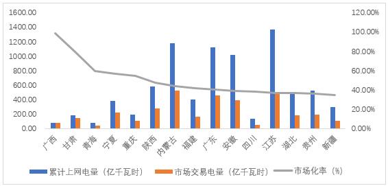 分省來看,全國市場交易電量規(guī)模排序前三名的省份分別為廣東省1940億千瓦時(含西電東送省間協(xié)議電量)、江蘇省1160億千瓦時和山東省970億千瓦時。外受電市場交易電量排序前三名的省份分別是廣東省1332億千瓦時(含西電東送省間協(xié)議電量)、浙江省363億千瓦時和山東省286億千瓦時。全國銷售電量市場化率排序前三名的省份是青海、廣西、廣東,分別為59.4%、52.0%、49.9%。