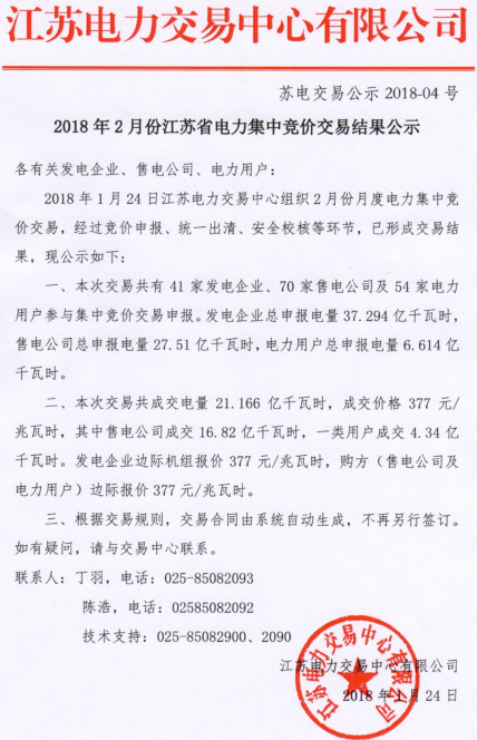 江蘇電力交易中心日前發(fā)布了《2018年2月份江蘇省電力集中競(jìng)價(jià)交易結(jié)果》,本次交易共有41家發(fā)電企業(yè)、70家售電公司及54家電力用戶參加集中...
