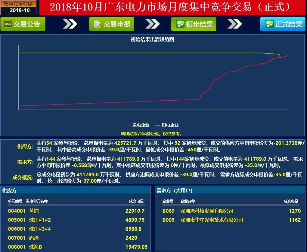 共有54 家參與報(bào)價(jià), 總申報(bào)電量為 425721.7 萬千瓦時(shí),其中 52 家初步成交,成交的供應(yīng)方平均申報(bào)價(jià)差為-201.3738厘/千瓦時(shí), 其中最高成交申報(bào)價(jià)差 -39.0厘/千瓦時(shí),最低成交申報(bào)價(jià)差 -450厘/千瓦時(shí)。