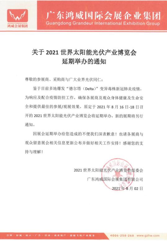 由于當(dāng)前國內(nèi)多地出現(xiàn)新型冠狀病毒肺炎新增確診病例、中高風(fēng)險地區(qū)不斷增加的疫情嚴(yán)峻形勢影響,為全力配合做好疫情防控工作,避免大規(guī)模聚集和降低疫情傳播風(fēng)險,保障參展商、觀眾及工作人員健康安全,維護(hù)參展單位權(quán)益,確保展會效果,組委會經(jīng)慎重研究決定,原定于8月16-18日在廣州·廣交會展館舉辦的2021世界太陽能光伏產(chǎn)業(yè)博覽會延期舉辦,展覽地點不變,具體辦展時間將另行通知。
