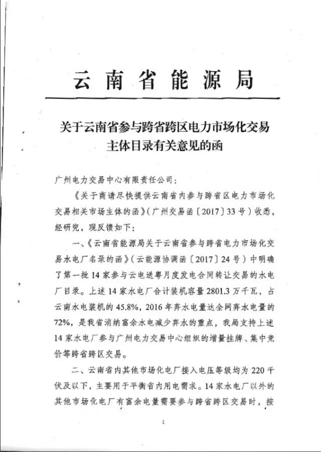 6月27日,云南能源局正式復(fù)函,同意14家水電廠參與廣州電力交易中心組織的增量掛牌、集中競(jìng)價(jià)等跨省跨區(qū)交易。復(fù)函同時(shí)指出,希望廣州電力交易中心做好市場(chǎng)主體服務(wù),并與昆明電力交易中心做好銜接,云南能源局也將就交易情況進(jìn)一步推動(dòng)更多企業(yè)到廣州電力交易中心參與跨省(區(qū))交易。