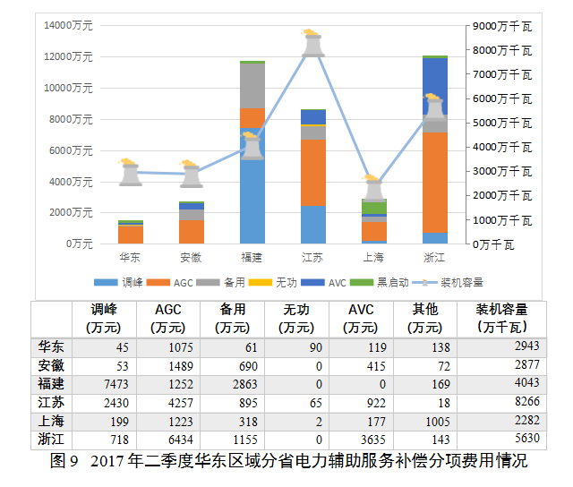 華東區(qū)域外來(lái)電落點(diǎn)較為集中,電源類型比較豐富,各省市之間體現(xiàn)出明顯的差異和互補(bǔ)性。福建以調(diào)峰費(fèi)用為主,而浙江則以AGC補(bǔ)償為主。浙江和福建的輔助服務(wù)補(bǔ)償標(biāo)準(zhǔn)較高;江蘇省由于本地平衡情況較好,輔助服務(wù)補(bǔ)償力度相對(duì)較小。與其他區(qū)域不同,除了五省市外,華東區(qū)域還單獨(dú)對(duì)網(wǎng)調(diào)機(jī)組進(jìn)行輔助服務(wù)補(bǔ)償和考核(見(jiàn)圖9)。