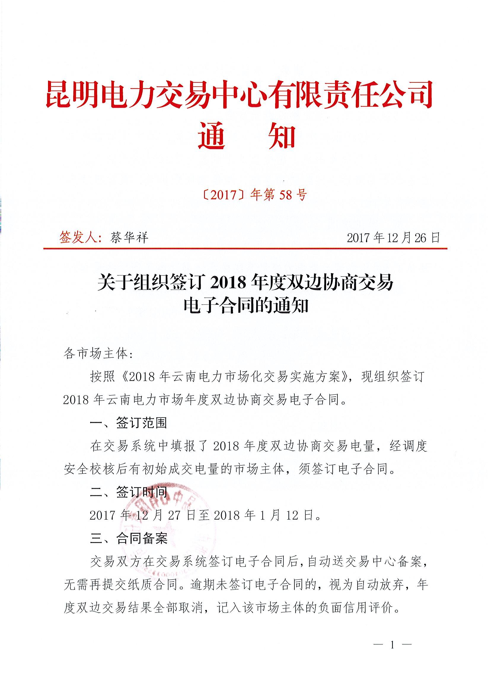 2017年12月26日,昆明電力交易中心發(fā)文《關(guān)于組織簽訂2018年度雙邊協(xié)商交易電子合同的通知》,通知各方市場(chǎng)主體簽訂電子合同。
