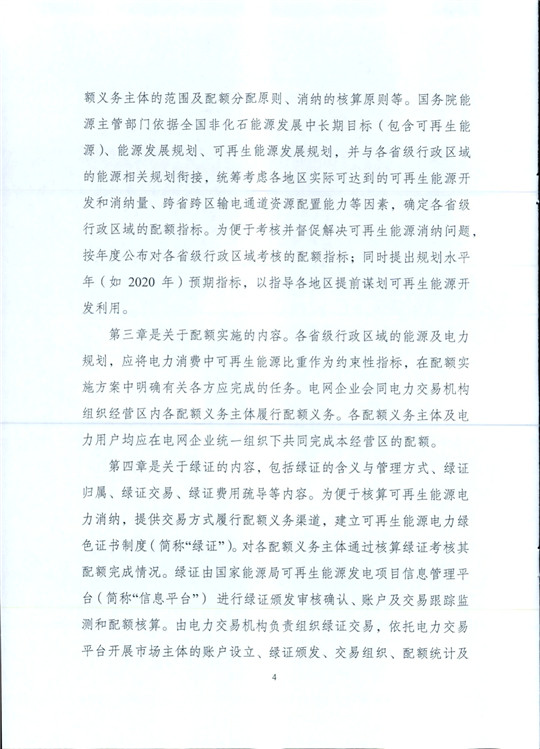 第四條 國務(wù)院能源主管部門按年度制定各省級行政區(qū)域可再生能源電力配額指標(biāo),對各省級行政區(qū)域的配額整體完成情況進(jìn)行監(jiān)測評價(jià)。各省級能源主管部門對本省級行政區(qū)域內(nèi)各配額義務(wù)主體進(jìn)行考核。