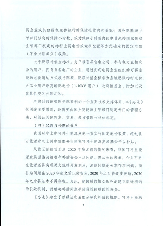 第二條 可再生能源電力配額是指國家根據(jù)全國可再生能源開發(fā)利用中長期總量目標(biāo)、能源發(fā)展戰(zhàn)略及規(guī)劃,對各省級行政區(qū)域內(nèi)的電力消費(fèi)規(guī)定最低可再生能源比重指標(biāo),包括可再生能源電力總量配額(簡稱“總量配額”)和非水電可再生能源電力配額(簡稱“非水電配額”)。
