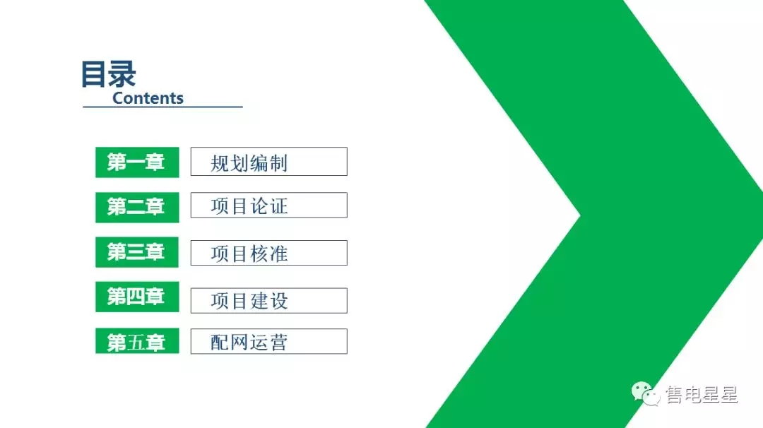 本課件通過規(guī)劃編制、項(xiàng)目論證、項(xiàng)目核準(zhǔn)、項(xiàng)目建設(shè)和配網(wǎng)運(yùn)營五個(gè)章節(jié)對增量配網(wǎng)的實(shí)施進(jìn)行拆分講解。