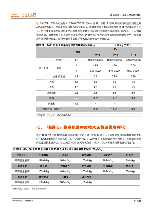 猜想六:19年動(dòng)力電池系統(tǒng)單價(jià)或?qū)⑼黄?.9元/wh。2021年國(guó)家補(bǔ)貼政策全面退出,特斯拉電池組目標(biāo)價(jià)格100美元/kwh,與傳統(tǒng)美日汽車(chē)龍頭目標(biāo)采購(gòu)價(jià)格接近;2021年國(guó)內(nèi)動(dòng)力電池配套均價(jià)或?qū)⑦_(dá)到600元/kwh。未來(lái)三年動(dòng)力電池年均降價(jià)幅度仍將達(dá)到15%左右水平。