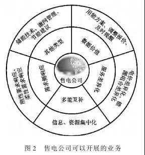 因此,增值業(yè)務(wù)的興起主要因?yàn)椋浩湟皇乾F(xiàn)行的新能源微電網(wǎng)試點(diǎn)、終端一體化多能互補(bǔ)試點(diǎn)、“互聯(lián)網(wǎng)+”智慧能源試點(diǎn)都說(shuō)明了能源企業(yè)不再提供單一的電力,而是多種能源組合和服務(wù)結(jié)合的新型經(jīng)營(yíng)方式。其二是隨著電的商品屬性的逐漸還原,傳統(tǒng)售電行業(yè)利潤(rùn)難以滿足售電公司的運(yùn)營(yíng)。其三是技術(shù)的進(jìn)步對(duì)能源有更加高效的使用。為此,售電公司有必要通過(guò)開(kāi)展增值業(yè)務(wù)去提升自己的綜合實(shí)力。圖2集中顯示了售電公司可以開(kāi)展的各種新業(yè)務(wù)。