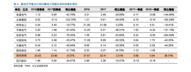 3)板塊內(nèi)唯一的亮點(diǎn)是輸電二次龍頭國電南瑞,2018 年一季度國電南瑞一方面實(shí)現(xiàn)整體訂單高速增長,另一方面確認(rèn)較大規(guī)模的配網(wǎng)融資租賃回購收入,拉動(dòng)營業(yè)收入同比增長近 20%;此外,公司毛利率同比上升 3.1 個(gè)百分點(diǎn),助推歸屬母公司股東凈利潤增長 39%。