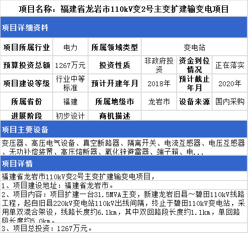 廣東省惠州市220千伏數(shù)碼園輸變電項(xiàng)目、內(nèi)蒙古自治區(qū)巴彥淖爾市220kV輸變電項(xiàng)目、內(nèi)蒙古自治區(qū)錫林郭勒市110千伏輸變電項(xiàng)目、新疆維吾爾族自治區(qū)110千伏輸變電項(xiàng)目、福建省龍巖市110kV變2號(hào)主變擴(kuò)建輸變電項(xiàng)目、山西省臨沂市110kV輸變電項(xiàng)目。最高項(xiàng)目總投資達(dá)14441萬元。