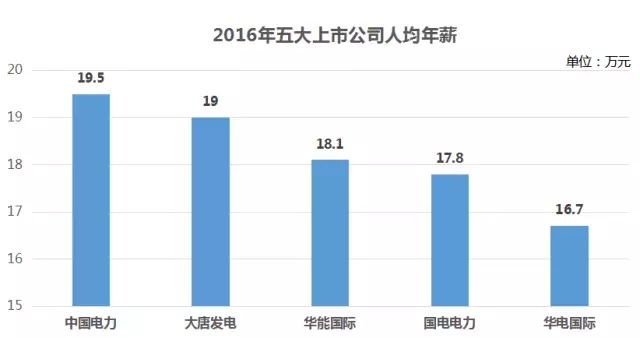 除了上述5大發(fā)電上市公司外,其他13家電企業(yè)也發(fā)布了年報(bào),經(jīng)統(tǒng)計(jì)得18家電企人均年薪為18.5萬元。其中新能泰山2016年業(yè)績虧損6671萬元,但其員工的人均年薪卻高達(dá)36萬元,比2015年的32萬元提高了4萬元,成為目前工資最高的電企。