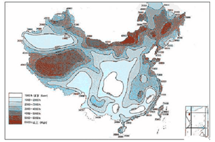 中國全年風(fēng)速大于3m/s小時(shí)數(shù)分布圖