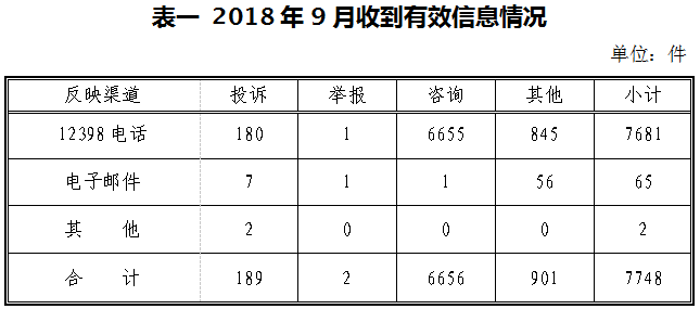 按反映渠道分類,12398電話7681件,電子郵件65件,其他2件。(2018年9月收到有效信息情況見表一)