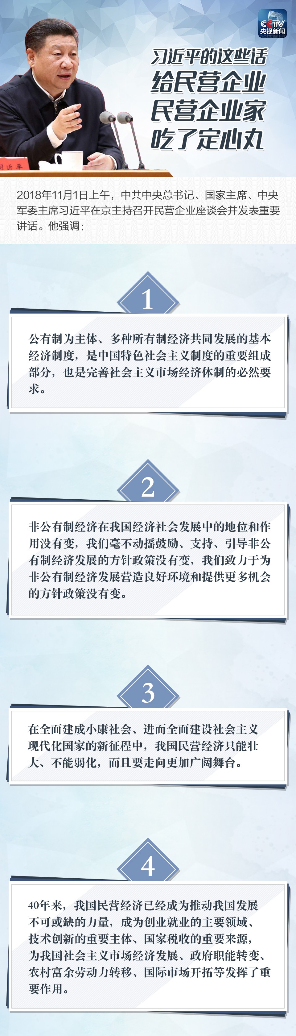 中共中央總書記、國家主席、中央軍委主席習(xí)近平11月1日上午在京主持召開民營企業(yè)座談會(huì)并發(fā)表重要講話。習(xí)總書記對(duì)民營經(jīng)濟(jì)發(fā)展都作出了哪些重要論述?