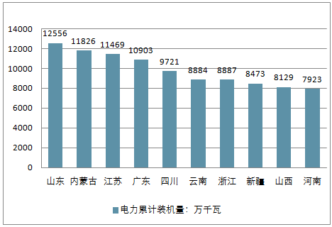 從累計裝機量區(qū)域情況來看,2017年全國累計裝機量第一的為山東省,達12556萬千瓦,占全國比重大7.07%;其次為內蒙古,2017年累計裝機量11826萬千瓦,6.65%;江蘇、廣東和四川分別以11469、10903、9721萬千瓦的累計裝機量分別位列第三只第五名。