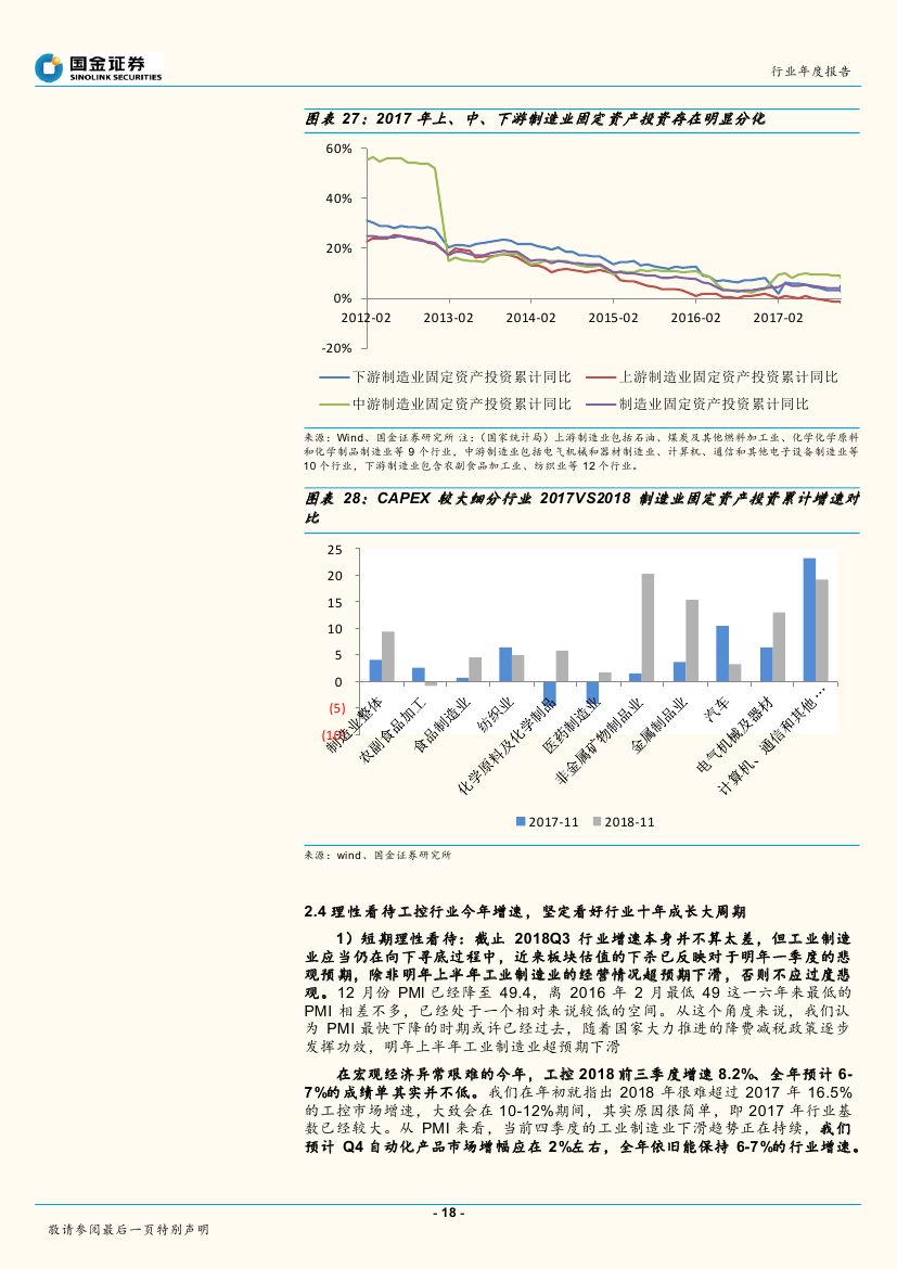 自動化:短期受宏觀經濟影響較大,2019 下半年有望再邁入成長軌道。截止 2018Q3 行業(yè)增長 8.2%并不算太差。短期:工業(yè)制造業(yè)應當仍在向下尋 底過程中,近來板塊估值的下殺已反映對于 2019 年 1 季度的悲觀預期;中 期:中小型企業(yè)改擴建項目需求依舊龐大,2019 年下半年在外部信貸放 松、利稅下調的外部友好政策下,利潤總額的企穩(wěn)和逐步轉暖的經營預期將 有望釋放這類需求。長期:工控行業(yè)已經步入了外部政策大力扶持、需求實質性增長的中速發(fā)展期,需要以戰(zhàn)略眼光看待自動化升級“黃金十年”。