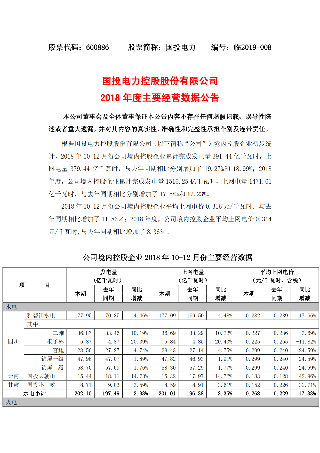“五大四小”之國(guó)投電力發(fā)布2018年度主要經(jīng)營(yíng)數(shù)據(jù)