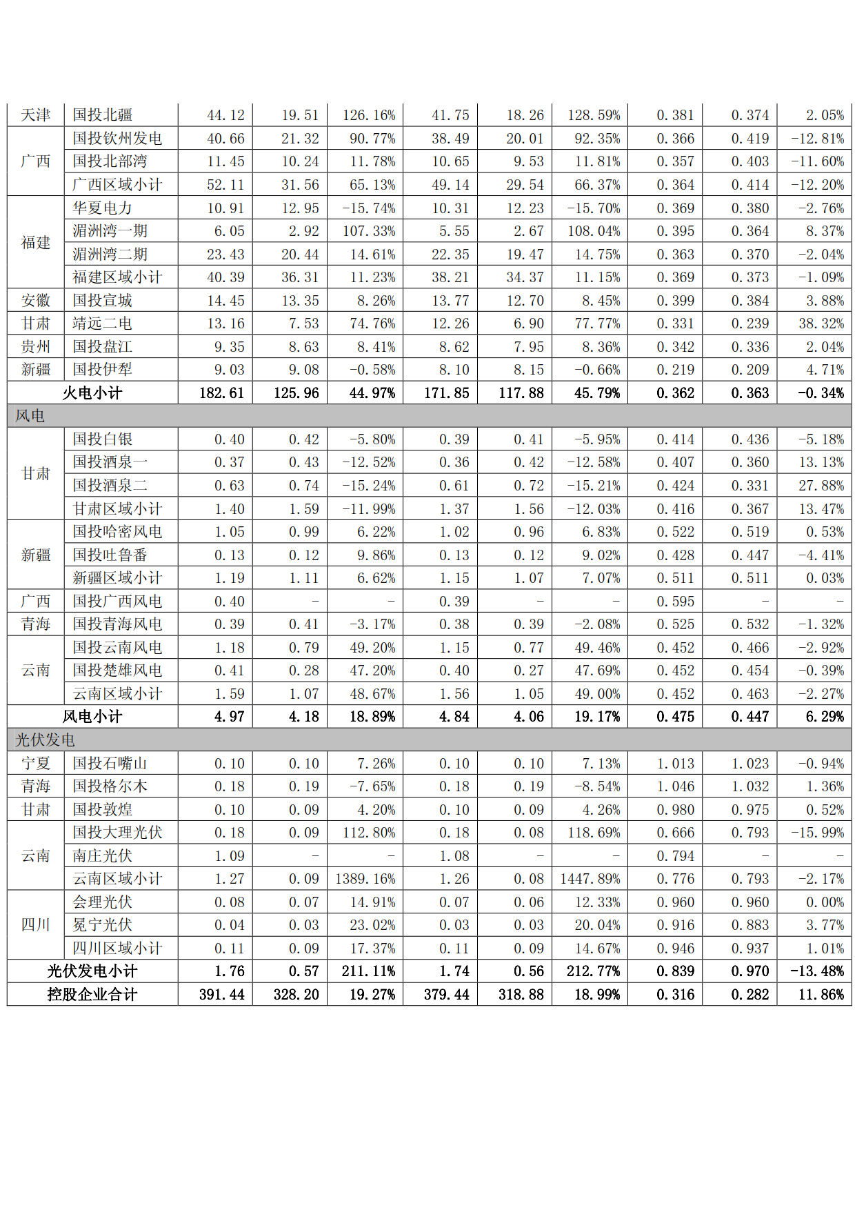 2、火電發(fā)電量總體同比增長(zhǎng)的主要原因:一是受全社會(huì)用電量增長(zhǎng)的影響,廣西、福建、甘肅火電機(jī)組利用小時(shí)數(shù)同比增加較多;二是公司火電所在部分區(qū)域降水量整體偏枯,水電負(fù)荷下降,火電發(fā)電量同比上升;三是湄洲灣二期 2×100 萬千瓦機(jī)組于去年下半年投產(chǎn),今年完全發(fā)揮效力;四是北疆二期 2×100萬千瓦機(jī)組于今年 6 月份投產(chǎn);五是國(guó)投北部灣與大用戶簽約直購(gòu)電量,發(fā)電量同比增幅較大。