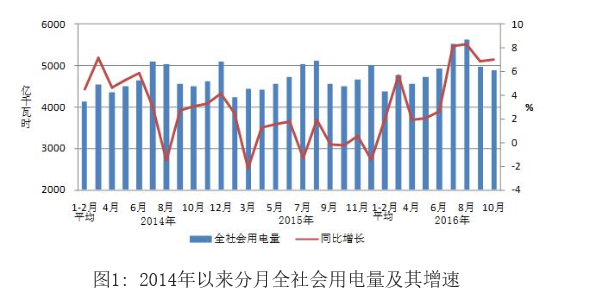 1-10月份,全國電力供需總體寬松。全社會用電量增速同比提高,三產(chǎn)和居民用電量保持較快增長;制造業(yè)用電量累計(jì)增速逐月提高,產(chǎn)業(yè)結(jié)構(gòu)調(diào)整繼續(xù)顯現(xiàn);黑色金屬冶煉行業(yè)用電降幅逐月收窄,10月份實(shí)現(xiàn)正增長;發(fā)電