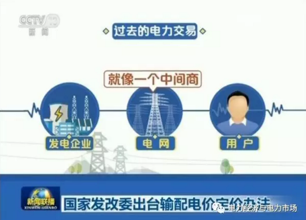 價格是市場的靈魂。2002年國務院頒布的《電力體制改革方案》(國發(fā)[2002]5號,后簡稱“5號文”)啟動了第一輪電力體制改革,雖然完成了廠網分開,但原定的競價上網市場改革方案卻沒有順利實施,改革成了半拉子工程。對于發(fā)電廠來說,電網是唯一買家,按國家規(guī)定的標桿上網電價從發(fā)電廠買電;而對于用戶來說,電網是唯一賣家,按國家規(guī)定的目錄銷售電價賣電給用戶。電網在電能商品的中間流通環(huán)節(jié)形成壟斷,切斷了供需之間的直接聯(lián)系,靠吃購銷差價獲取利潤,沒有獨立輸配電價。在電網環(huán)節(jié)成本沒有任何監(jiān)管,管住了兩頭,放過了中央,帶來諸如過度投資等許多問題。2015年3月15日,中共中央、國務院聯(lián)合發(fā)布《關于進一步深化電力體制改革的若干意見》(中發(fā)〔2015〕9號文,后簡稱“9號文”),按“管住中央放開兩頭”的思路,打破電網壟斷,讓供方(發(fā)電廠)和需方(大用戶和售電公司)直接見面,電網變成電能的“高速公路”,收取過路費,因此輸配電價的核定相當重要。圖2~圖11(來自央視報道截屏)說明了這個改革過程。