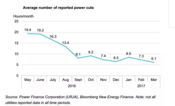 從2016年開始,印度政府提升了電網(wǎng)數(shù)據(jù)的透明度。如今,盡管大多數(shù)的停電已經(jīng)少于平均每天6小時(shí),依然有480萬生活在城鎮(zhèn)、被統(tǒng)計(jì)到的印度人在忍受著超過平均每天6小時(shí)的停電。