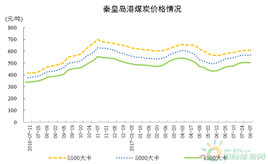6月份進(jìn)入“迎峰度夏”以來(lái),用電負(fù)荷持續(xù)攀高,煤炭需求不斷增加,同時(shí)受進(jìn)口量減少等因素的影響,秦皇島煤炭?jī)r(jià)格連續(xù)8周上漲。截至8月7日,秦皇島5500大卡煤炭平倉(cāng)價(jià)每噸608元,比7月初上漲23元;5000大卡每噸569元,上漲28元;4500大卡每噸503元,上漲31元。