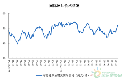 原油價(jià)格有所回升,但仍處于低位。截至7月31日,布倫特原油現(xiàn)貨離岸價(jià)格為52.0美元/桶,比6月底回升4.9美元/桶,與年初基本持平。