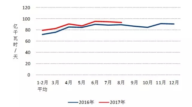 圖3 2016、2017年以來分月制造業(yè)日均用電量