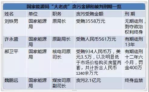 國(guó)家能源局系統(tǒng)內(nèi),劉鐵男非法收受財(cái)物3558萬(wàn)元,被判處無(wú)期徒刑,剝奪政治權(quán)利終身;許永盛非法收受財(cái)物561萬(wàn)元,被判有期徒刑13年;郝衛(wèi)平非法收受財(cái)物934萬(wàn)元人民幣,美元3.5萬(wàn),以及明顯低于市場(chǎng)價(jià)格購(gòu)買房屋兩套,共計(jì)折合人民幣1240余萬(wàn)元,被判處有期徒刑十二年六個(gè)月,罰金400萬(wàn)元;魏鵬遠(yuǎn)非法收受財(cái)物約2.1億元,被判判處死刑,緩期二年執(zhí)行,在其死刑緩期執(zhí)行二年期滿依法減為無(wú)期徒刑后,終身監(jiān)禁,不得減刑、假釋。