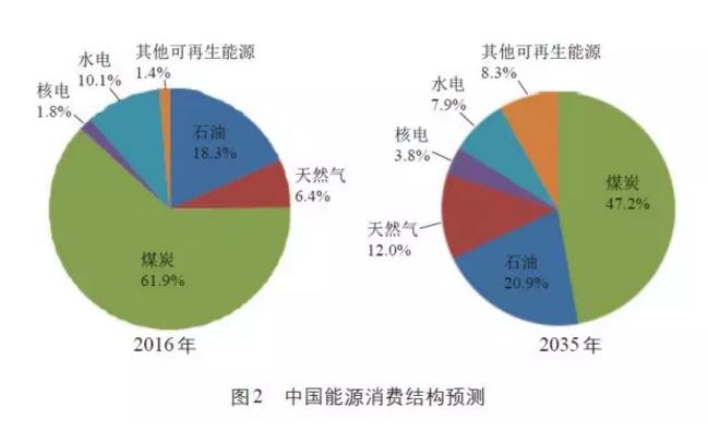 未來20 年,隨著經(jīng)濟發(fā)展方式轉(zhuǎn)變和能源效率不斷提高,我國能源消費增速將不斷下降。預計我國能源需求將由2016 年的43.6 億噸標煤增長到2035 年的51.4 億噸標煤,增長17.9%,年均增長0.9%?;茉粗?,天然氣年均增長4.6%,石油年均增長1.6%,煤炭年均下降0.6%。核電和非水電可再生能源增長較快,年均增速分別達到6.1% 和7.4%。