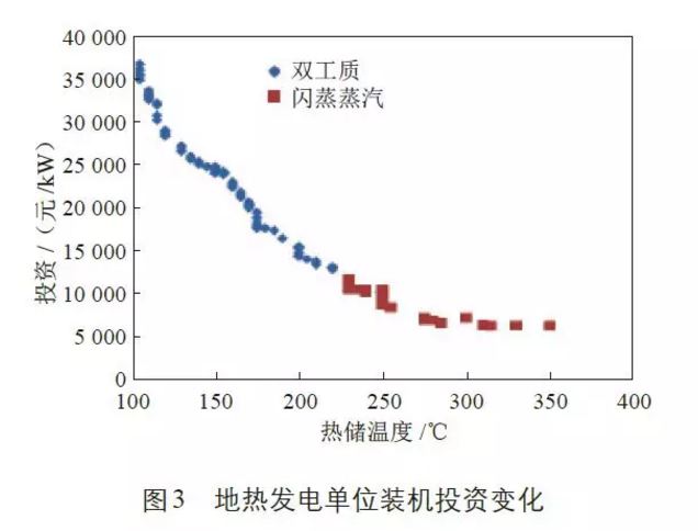 地熱供暖成本約為15.5 元/m2,相比燃煤鍋爐供暖23 元/m2 的供暖成本(含鍋爐房、熱力供應系統(tǒng))具有較強的優(yōu)勢。地熱供暖項目建設期投資包括鉆井工程、管網(wǎng)敷設和地面工程三大項目;地熱供暖項目運營成本主要包括電費、工人工資、設備維修費、折舊費、稅費等。地熱發(fā)電成本對資源條件依賴較大,全球地熱發(fā)電成本在0.26 ~ 0.72 元/kW˙h 之間,我國當前地熱發(fā)電成本約0.7 元/kW˙h。地熱發(fā)電的單位裝機投資與熱儲溫度直接相關,詳見圖3,當溫度升高約300℃以后,地熱發(fā)電單位裝機的投資基本保持不變。