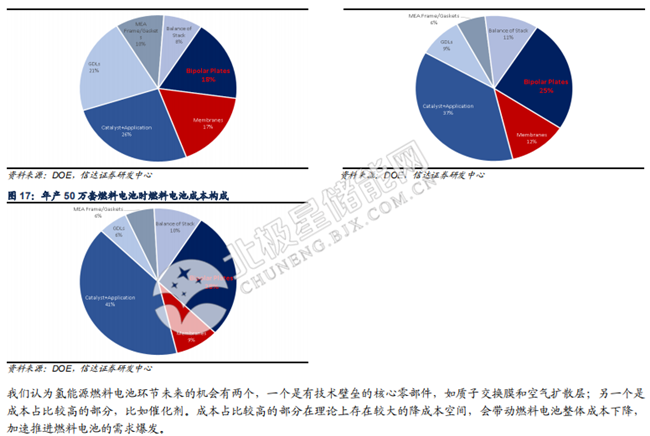 氫能源產(chǎn)業(yè)鏈:日益完善,整裝待發(fā)。氫能源產(chǎn)業(yè)鏈包括上游制氫產(chǎn)氫、氫氣儲存運輸、加 氫站運營、中游燃料電池系統(tǒng)及零部件生產(chǎn)制造、下游氫燃料電池應(yīng)用等眾多環(huán)節(jié)。同時, 圍繞氫氣展開的主產(chǎn)業(yè)鏈條需要大量高技術(shù)含量機械設(shè)備支持,主要集中在制氫和壓縮領(lǐng)域。我們認為,制氫路徑會按照制氫地的資源稟賦不同而有所變化,儲氫環(huán)節(jié)主要還是氣態(tài)儲氫,但合金儲氫前景較好,加氫站環(huán)節(jié)會呈現(xiàn)中央制氫與分布式制氫共存互補的格局,燃料電池環(huán)節(jié)的機會在于質(zhì)子交換膜、低成本催化劑以及儲氫瓶,下游應(yīng)用環(huán)節(jié)中汽車市場最大,汽車應(yīng)用市場中,我們預(yù)計氫燃料電池商用車市場最先爆發(fā)。
