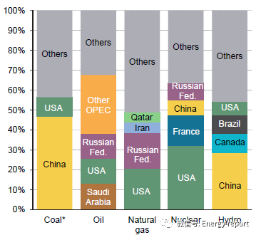 各國之間的能源產(chǎn)量大相徑庭:對于每一種燃料,通常不到5個國家的該燃料的產(chǎn)量占據(jù)了全世界該燃料產(chǎn)量的一半以上(如圖5所示)。2016年,中國的煤炭產(chǎn)量就接近了世界煤炭總產(chǎn)量的一半,中國水電發(fā)電量占全世界水電發(fā)電總量的29%。而美國和法國的核電發(fā)電量合計也幾乎達到了全世界的50%。沙特、俄羅斯和美國的原油產(chǎn)量的總和占全世界原油總量的接近40%,而后二者的天然氣產(chǎn)量則達到了全世界天然氣產(chǎn)量的40%。