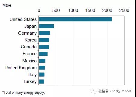 圖14 2017年一次能源供應(yīng)總量前十名的經(jīng)合組織國家