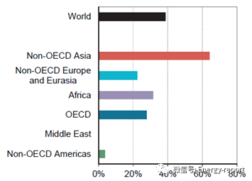 亞洲地區(qū)非經(jīng)合組織國家(包含中國)的終端能源消費量占比從21世紀(jì)初增長到了2016年的34%。同時,受2008年全球金融危機的影響,經(jīng)合組織國家終端能源消費不在呈增長趨勢,終端能源消費量在一個水平上上下波動,消費量為35億噸油當(dāng)量,占比達38%(如圖12所示)。
