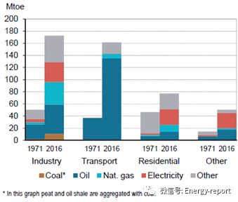 1971年,石油在終端能源消費中的占比達到一半,并在1979年石油危機前達到頂峰,為55%。然而,電力和天然氣在居民和工業(yè)部門應(yīng)用的增加導(dǎo)致了石油在終端能源消費中的占比略有下降,其2016年占比為46%。期間,電力消費的占比幾乎翻了3倍,2016年其占比達到了18%。天然氣消費從略低于4%增長至13%,這主要是因為工業(yè)部門天然氣消費占比從7%增長至22%,居民部門天然氣消費占比從4%增長至15%。