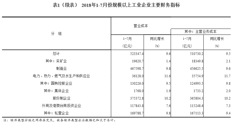 表1 2018年1-7月份規(guī)模以上工業(yè)企業(yè)主要財(cái)務(wù)指標(biāo)