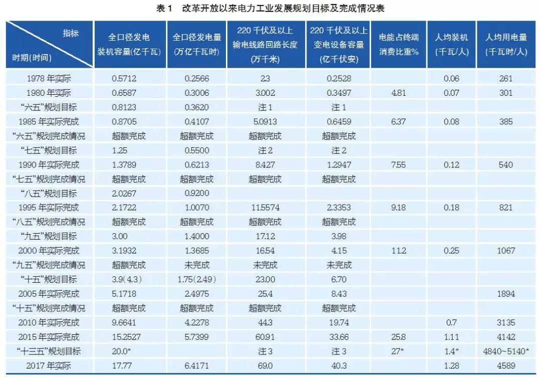 改革開放以來,我國電力工業(yè)發(fā)展取得了輝煌成就。電力工業(yè)發(fā)展和電力規(guī)劃目標(biāo)及完成情況詳見表1。