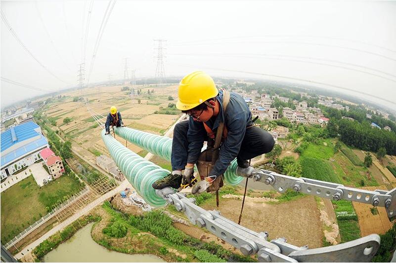 【背景】 在安徽省淮南市洛河鎮(zhèn)境內(nèi),安徽送變電工程公司施工人員在70多米高空進行500千伏輸電線路開斷施工?! ‘斎?,由安徽送變