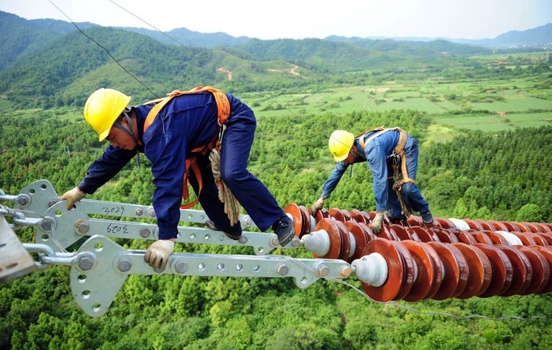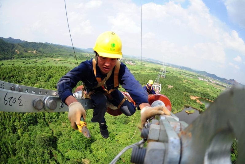 7月30日,在江西省高安市獨(dú)城鎮(zhèn)境內(nèi),幾名電力施工人員冒著高溫在70米高的特高壓輸電鐵塔上安裝附件。當(dāng)日,江西省高安市最高氣溫達(dá)到37攝氏度。400余名安徽送變電工程公司的施工人員頭頂烈日,堅(jiān)守在溪洛渡左