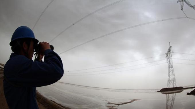國(guó)網(wǎng)青海檢修公司的輸電線路驗(yàn)收地面配合人員通過用望遠(yuǎn)鏡對(duì)高空驗(yàn)收人員進(jìn)行監(jiān)護(hù)。目前,新疆與西北主網(wǎng)聯(lián)網(wǎng)750千伏第二通道工程驗(yàn)收工作正在有序進(jìn)行中。該工程在青海境內(nèi)涉及2站4線,大部分處于海拔3000米以上,地處高原、自然環(huán)境惡劣、地質(zhì)情況復(fù)雜,有鹽湖、沼澤和戈壁,是全線路各標(biāo)段中難度系數(shù)最大、工程技術(shù)要求較高的標(biāo)段,其中跨越鹽湖區(qū)共計(jì)85基鐵塔,40.34公里線路。
