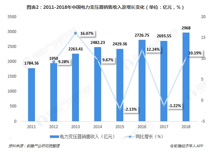 2011-2018年電力變壓器行業(yè)的銷售收入整體呈上漲態(tài)勢(shì),2017年電力變壓器行業(yè)實(shí)現(xiàn)銷售收入2693.55億元,同比下降1.22%。2018年電力變壓器行業(yè)銷售收入為2968億元,同比增長10.19%。