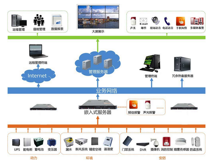 ?  實時報警功能,如機房發(fā)生故障,能通過聲光報警、電話,短信,郵件等多種方式通知機房運營維護人員。