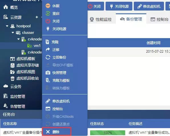 1.首先云平臺物理服務(wù)器cvknode1上有一臺虛擬機(jī)vm1,對虛擬機(jī)右擊做備份,如下圖所示: