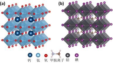 (a)鈦酸鈣(GaTiO3)晶體的原子結(jié)構(gòu);(b)鈣鈦礦太陽能中吸光層物質(zhì)甲氨鉛碘(CH3NH3PbI3)晶體的原子結(jié)構(gòu)。