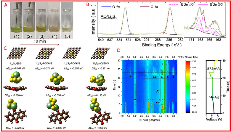 圖2.(A)多硫化鋰溶液中滴加蒽醌分散液的溶液顏色變化圖;(B)多硫化鋰-蒽醌復(fù)合物的XPS成像;(C)密度泛函理論計算及(D)多硫化鋰-蒽醌復(fù)合物的原位X射線表征。
