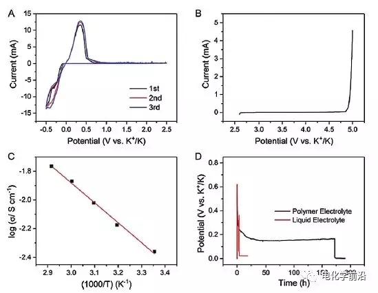 同時(shí)為抑制鉀枝晶的生成,研究人員引入交聯(lián)型PMMA為基礎(chǔ)的凝膠聚合物電解質(zhì),該復(fù)合電解質(zhì)可以耐受4.9V的高壓,離子電導(dǎo)率為4.3×10−3  S/cm,活化能僅為0.27eV。對(duì)稱電池測(cè)試,該凝膠聚合物電解質(zhì)可連續(xù)正常工作172.3h,而普通電解液僅能維持2.2h,對(duì)枝晶的抑制效果明顯。