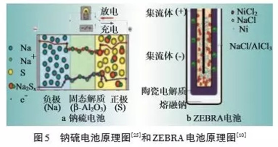 鈉硫電池的正負(fù)極材料分別為熔融態(tài)的硫和鈉,電解質(zhì)為氧化鋁陶瓷管,當(dāng)工作溫度在300~350℃。鈉硫電池的原理圖如圖5a所示,鈉離子透過電解質(zhì)隔膜與硫之間發(fā)生的可逆反應(yīng),從而進(jìn)行能量的釋放和儲存。鈉硫電池的理論比能量高達(dá)760Wh/Kg,實(shí)際可達(dá)150Wh/Kg,為鉛酸電池的3—4倍,充放電效率高,循環(huán)壽命較長。ZEBRA電池與鈉硫電池的結(jié)構(gòu)十分相似,但不同的是ZEBRA以固態(tài)多孔的二氯化鎳(NiCl2)等為正極并且加入液態(tài)的NaAlCl4為二次電解質(zhì),其原理圖如圖5b所示。ZEBRA電池放電時,負(fù)極中的金屬鈉離子化后通過β"-A12O3,擴(kuò)散到正極與NiCl2反應(yīng)生成Ni金屬和NaCl,充電則執(zhí)行相反的過程。ZEBRA電池的能量密度可達(dá)到100Wh/Kg,壽命較長,儲能成本低,具有較好的耐過充過放特性,安全性能較高。