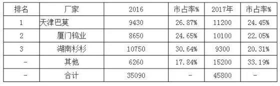 2016-2017年國(guó)內(nèi)主要NCM廠家產(chǎn)量及市占率(噸,%)