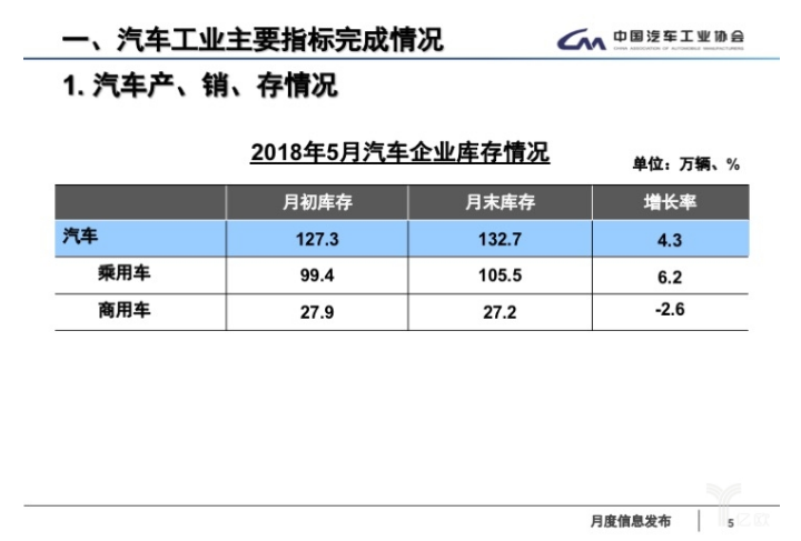 在具體數(shù)據(jù)方面,5月,汽車生產(chǎn)234.44萬輛,環(huán)比下降2.26%,同比增長12.84%;銷售228.77萬輛,環(huán)比下降1.37%,同比增長9.61%。1-5月,汽車產(chǎn)銷1176.80萬輛和1179.24萬輛,同比增長3.84%和5.71%,增速比1-4月提升2.06個百分點和0.93個百分點。